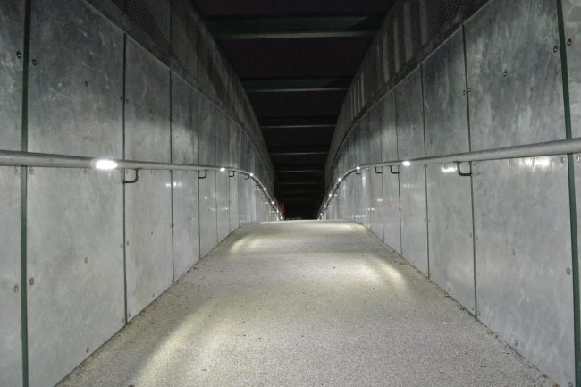 To illuminate the bridge deck RL348 LED luminaries are mounted within the 48.3mm DIA, galvanised mild steel handrail section that forms the parapet handrail. Luminaires are mounted in a staggered formation on both sides of the bridge on approximately 3.5M centres.