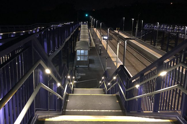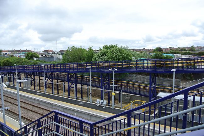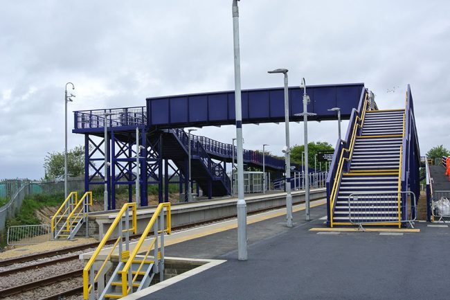 As part of the new station development, a bridge structure with staircases and access ramps has been constructed, to provide access for passengers between the two platforms and the carpark.